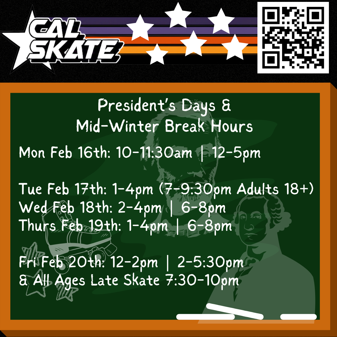 All Ages Afternoon Skates Monday February 9th and Monday February 16th-20th. Afternoon hours and pricing varies and can be found on our full schedule at calskate.com/schedule