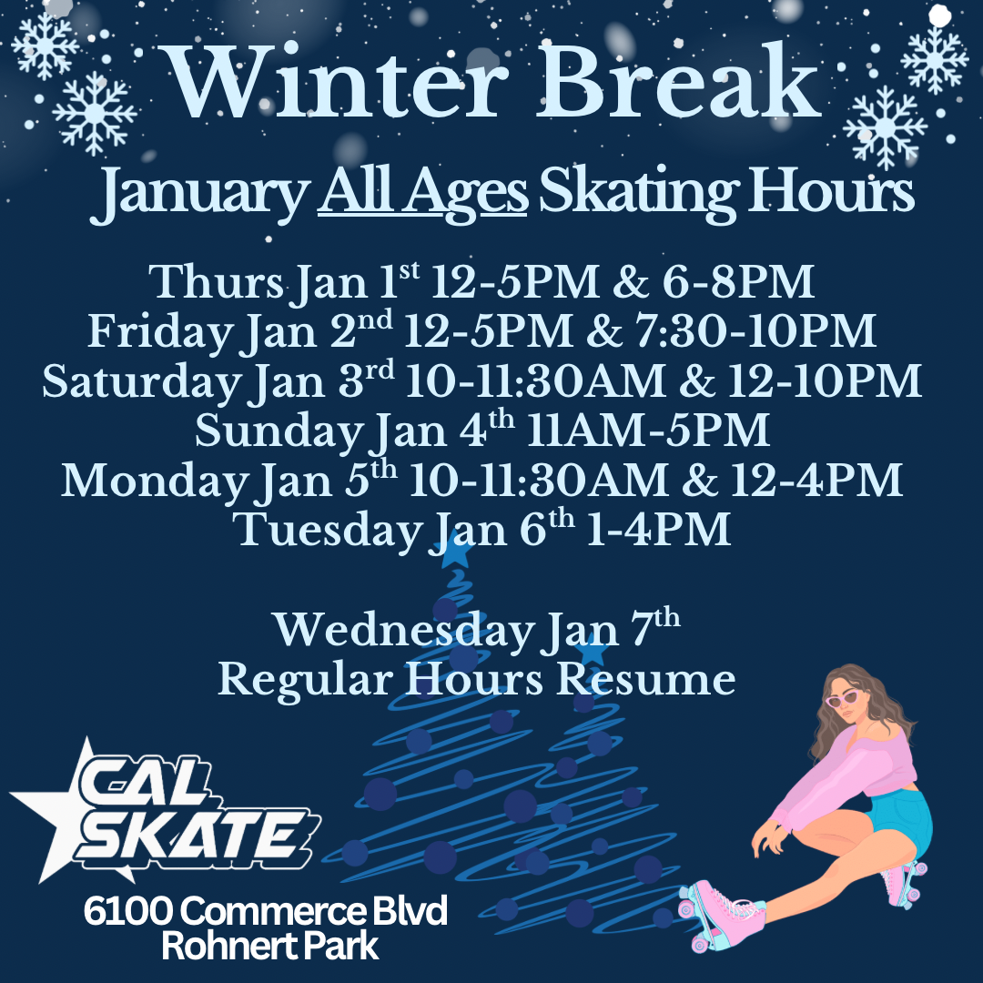 Cal Skate of Rohnert Park is a locally owned family-run roller skating rink providing all ages entertainment in the friendly city of Rohnert Park! We offer group skating classes, private skating lessons, and proudly host the Rohnert Park Artistic Skating Club, North Coast Inline Racing, and North Bay Roller Derby. We have all ages open skate times, weekly adult skate nights, monthly events and are a birthday party and STEM Field Trip destination. We are invested in our community, raising $36,000 annually for local non-profit organizations and schools with our Skate & Donate Fundraisers. Discounted group rates are also available for school groups, licensed day cares and camps with reservations. Our schedule fluctuates seasonally, expanding our weekday hours during school holidays and breaks and is updated regularly at calskate.com.